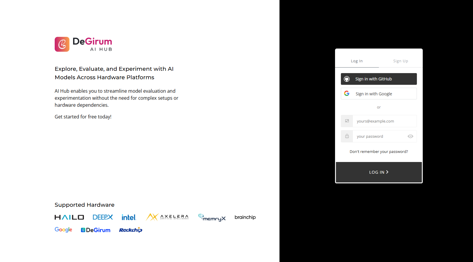 To begin using the AI Hub, go to the [AI Hub](https://hub.degirum.com/?utm_source=docs.degirum.com\&utm_medium=site\&utm_campaign=ai-hub-quickstart), click **Sign Up,** and create your account with your email.